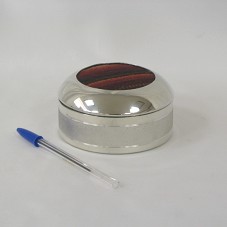 PORTA-JÓIA (5,5X11 CM) DE FORMATO CIRCULAR CONFECCIONADO EM PRATA COM TRABALHO DE TAPEÇARIA NA TAMPA. POSSUI FAIXA APICOADA EM SUA CIRCUNFERÊNCIA. TAPEÇARIA EM TONS DE VINHO E MARROM, COM LISTRAS EM DEGRADÊ. FORRADO INTERNAMENTE EM VELUDO VINHO. ACONDICIONADO EM ESTOJO FORRADO DE VELUDO VINHO.