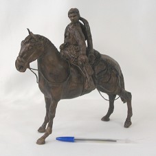 ESCULTURA (24X24X13 CM) MODELADA EM RESINA E CERÂMICA, COM ARMAÇÃO EM METAL. REPRESENTA UM HOMEM MONTADO À CAVALO, CARREGANDO UM BERRANTE (SOLTO DA ESCULTURA). OBJETO EM TONS DE MARROM.