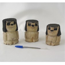 CONJUNTO DE TRÊS ESCULTURAS (11,5; 10 E 9 CM) ESCULPIDAS EM MADEIRA E REVESTIDAS EM RESINA. REPRESENTAM TRÊS FIGURAS HUMANAS ESTILIZADAS, COMO SE FOSSEM UM TOTEM. PEÇAS IGUAIS, MAS DE TAMANHOS DIFERENTES, NA COR BEGE COM CABELOS, OLHOS E BOCAS EM PRETO. EM CADA PEÇA, NOME DO ARTISTA 'MARIANO NETO'.
