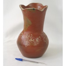 VASO DECORATIVO (24 CM) CONFECCIONADO EM ARGILA, COM BOJO INFERIOR ABAULADO E ORNADO COM PINTURA DE FLORES. POSSUI GARGALO COMPRIDO. NO FUNDO EXTERNO DA BASE, A INSCRIÇÃO 'ALDEIA CACHOEIRINHA / MIRANDA-MS / JUSTINA LANALI'.