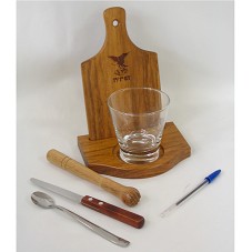 CONJUNTO PARA CONFECÇÃO DE CAIPIRINHA COMPOSTO POR: COPO CILÍNDRICO COM BRASÃO DO '1º/1º GT' GRAVADO; UM SOCADOR EM MADEIRA; UMA COLHER DE CABO GRANDE; UMA FACA SERRILHADA; UMA TÁBUA DE MADEIRA (22X13 CM), COM MESMO BRASÃO GRAVADO; E, UMA BASE DE MADEIRA (2X17X13 CM) PARA COLOCAÇÃO DO COPO E DA TÁBUA. ACONDICIONADO EM CAIXA DE PAPELÃO MARROM.