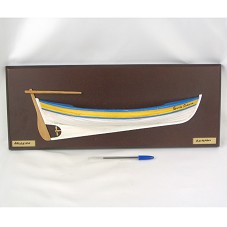 QUADRO EM MADEIRA ESCURA (19X49 CM), SERVINDO DE BASE PARA MAQUETE DE UMA BALEEIRA (BARCO DE PESCA ARTESANAL). MAQUETE MOSTRANDO APENAS METADE DO BARCO, PINTADO EM BRANCO, AZUL E AMARELO, COM A INSCRIÇÃO 'SANTA CATARINA'. NA BASE, DUAS PLACAS. NA PRIMEIRA, 'BALEEIRA'; NA SEGUNDA 'R.A. TOFANI'. ATRÁS, ETIQUETA COLADA COM DESCRIÇÃO DA PEÇA. ACONDICIONADO EM CAIXA DE PAPELÃO FORRADA COM PAPEL ARTESANAL BRANCO E VERDE, CONFECCIONADO NO PRESÍDIO MASCULINO DE FLORIANÓPOLIS E COMERCIALIZADO PELO INSTITUTO DA TERRA.