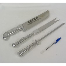 CONJUNTO PARA CHURRASCO, EM AÇO INOX, TODOS COM CABOS POLIDOS E TRABALHADOS, COMPOSTO POR: CHAIRA ESTRIADA (34 CM), GARFO DE CHURRASCO (34 CM), E FACA COM LÂMINA LARGA, ONDE HÁ GRAVADO A INSCRIÇÃO 'CAIXA / CAIXA ECONÔMICA FEDERAL'. ACONDICIONADO EM ESTOJO (4,5X39X16 CM) DE MADEIRA PINTADO DE MARROM, COM O NOME DA INSTITUIÇÃO NA TAMPA.