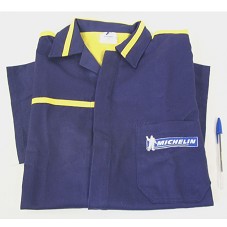 CAMISA-UNIFORME (TAM 50) EM BRIM AZUL, DE MANGA CURTA, COM DETALHES EM AMARELO. NA FRENTE E ATRÁS, ESTAMPA COM A LOGOMARCA DA 'MICHELIN'.