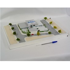 MAQUETE (3,5X40X25 CM) DA 'UNIDADE DE PRONTO ATENDIMENTO 24 HORAS', DA SECRETARIA DE SAÚDE E DEFESA CIVIL DO ESTADO DO RIO DE JANEIRO. MAQUETE MOSTRANDO A ARQUITETURA DO PRÉDIO E SUA RELAÇÃO COM O ENTORNO. COMPOSTA POR PRÉDIO MAIOR COM TRÊS BLOCOS, GUARITA, UM PRÉDIO MENOR E UMA TORRE DE CAIXA D'ÁGUA. FIXADA EM BASE BRANCA, ONDE HÃ, NA LATERAL, ETIQUETA COM DADOS DO FABRICANTE. POSSUI REDOMA EM ACRÍLICO.