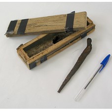 ESTOJO (4X20X5 CM) FORMADO COM TACOS DE MADEIRA, COM FURO NA PARTE POSTERIOR, GUARDANDO UM PREGO ANTIGO (16 CM), EM ESTADO DE FERRUGEM E CORROSÃO. ESTOJO ARMADO COM PREGOS E FITA ISOLANTE. ACOMPANHA BILHETE EM NOME DE JOAQUIM G. MESQUITA, FUNCIONÁRIO DA PREFEITURA MUNICIPAL DE PINHEIRAL/RJ, ENCAMINHANDO O OBJETO, DE 157 ANOS, AO PRESIDENTE.