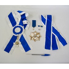 ORDEM DO MÉRITO APERIPÊ, NO GRAU DE GRÃ-CRUZ, COMPOSTA POR: FAIXA EM CETIM BRANCO COM LISTRA AZUL, CARREGANDO INSÍGNIA PRESA À ROSETA, CONFECCIONADA EM METAL DOURADO, NO FORMATO DE UMA CRUZ BRANCA, COM MOEDA EM SEU CENTRO, ONDE HÁ A INSCRIÇÃO 'ORDEM DO MÉRITO APERIPÊ' E UM DESENHO (NÃO IDENTIFICADO), NO REVERSO, 'ESTADO DE SERGIPE'; FAIXA EXTRA, MAIS ESTREITA; PLACA COM MESMA INSÍGNIA, TENDO AO SEU REDOR RAIOS DOURADOS; MINIATURA DE INSÍGNIA PRESA À FITA AZUL COM LISTRA BRANCA; UMA BARRETA EM METAL DOURADO, COM PARTE ANTERIOR ESMALTADA EM AZUL E BRANCO, TENDO AO CENTRO DESENHO DA INSÍGNIA; E UM BÓTON EM METAL DOURADO, ESMALTADO EM AZUL E BRANCO. ACOMPANHA CERTIFICADO DE GARANTIA, ONDE HÁ NA PARTE POSTERIOR HÁ A INSCRIÇÃO MANUSCRITA 'TROCAR A ROSETA / PEGAR A DO CONJUNTO QUE FOI ANTERIORMENTE'. ACONDICIONADO EM ESTOJO FORRADO DE VELUDO AZUL MARINHO.