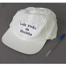 BONÉ EM TECIDO BRANCO. NA FRENTE, BORDADO EM PRETO A INSCRIÇÃO 'LULA IRMÃO DA ROCINHA'.