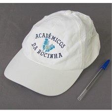 BONÉ EM TECIDO BRANCO. NA FRENTE, BORDADO EM AZUL 'ACADÊMICOS DA ROCINHA' E DESENHO DE UMA BORBOLETA. CONFECCIONADO EM TECIDO COM PROTEÇÃO SOLAR.