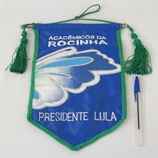 FLÂMULA (29X19 CM) EM TECIDO AZUL, COM DETALHES EM VERDE. NA FRENTE, BORDADO EM BRANCO 'ACADÊMICOS DA ROCINHA / PRESIDENTE LULA' E DESENHO DA ASA DE UMA BORBOLETA. POSSUI BASTÃO METÁLICO.