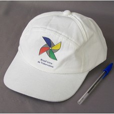 BONÉ EM TECIDO BRANCO. NA FRENTE, ESTAMPA COM DESENHO DE UM CATA-VENTO COLORIDO E A INSCRIÇÃO 'BRASIL LIVRE DA TUBERCULOSE'.