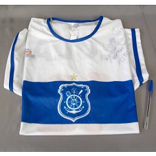 CAMISETA (TAM G) EM MALHA BRANCA, DE MANGA CURTA, COM DETALHES EM AZUL. NA FRENTE, FAIXA HORIZONTAL AZUL, COM BRASÃO DO TIME DE FUTEBOL 'OLARIA ATLÉTICO CLUBE'. ATRÁS, O NÚMERO '13' E A INSCRIÇÃO 'LULA'. POSSUI DEDICATÓRIA MANUSCRITA NA PARTE FRONTAL 'AO PRESIDENTE LULA O RECONHECIMENTO E A GRATIDÃO DO OLARIA ATLÉTICO CLUBE' E ASSINATURA (J.Z....)