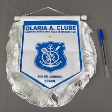 FLÂMULA (22,5X16,5 CM) EM TECIDO BRANCO, COM DETALHES EM AZUL, E FRANJAS BRANCAS NAS EXTREMIDADES. NA FRENTE, O BRASÃO DO TIME DE FUTEBOL 'OLARIA ATLÉTICO CLUBE', E A INSCRIÇÃO 'CAMPEÃO BRASILEIRO TAÇA DE BRONZE 1981 / RIO DE JANEIRO / BRASIL'. FIXADA EM BASTÃO PLÁSTICO.