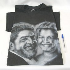 CAMISETA (TAM GG) EM MALHA PRETA, DE MANGA CURTA. NA FRENTE, EM BRANCO E CINZA, DESENHO RETRATANDO O PRESIDENTE LULA AO LADO DA PRIMEIRA-DAMA MARISA, COM A INSCRIÇÃO 'SEJA BEM VINDO A ROCINHA PAC'. DESENHO ASSINADO POR 'WARK'. ATRÁS, PRÓXIMO À BARRA, '[email protected]'.