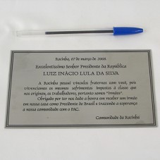 PLACA (10X15,5 CM) EM METAL PRATEADO, CONTENDO A INSCRIÇÃO 'ROCINHA, 07 DE MARÇO DE 2008 / EXCELENTÍSSIMO SENHR PRESIDENTE DA REPÚBLICA / LUIZ INÁCIO LULA DA SILVA / A ROCINHA POSSUI VÍNCULOS FRATERNOS COM VOCÊ, POIS VIVENCIAMOS OS MESMOS SOFRIMENTOS IMPOSTOS À CLASSE QUE NOS ORIGINOU, OS TRABALHADORES, PORTANTO SOMOS IRMÃOS. OBRIGADO PRO TER NOS DADO A HONRA EM RECEBER UM IRMÃO EM NOSSA CASA COMO PRESIDENTE DO BRASIL E TRAZENDO A ESPERANÇA A NOSSA COMUNIDADE COMO PAC. COMUNIDADE DA ROCINHA'. ACONDICIONADA EM ESTOJO FORRADO DE LYCRA AZUL.