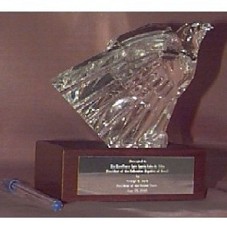 ESCULTURA EM CRISTAL (12X10 CM) DE UMA ÁGUIA EM POSIÇÃO DE LEVANTAR VÔO. ACOMPANHA BASE EM MADEIRA (12,5X9,5X4,5 CM), COM FACE INFERIOR E SUPERIOR FORRADA EM CAMURÇA PRETA. NA FRENTE DA BASE, UMA PLACA (3X10 CM) EM METAL PRATEADO COM A INSCRIÇÃO: 'PRESENTED TO HIS EXCELLENCY LUIZ INACIO LULA DA SILVA PRESIDENT OF THE FEDERATIVE REPUBLIC OF BRAZIL BY GEORGE W. BUSH PRESIDENT OF THE UNITED STATES JUNE 20, 2003'. ACONDICIONADA EM CAIXA DE PAPELÃO (19,5X18X17,5 CM) NA COR BEGE ACINZENTADO E TAMPA NA COR PRETA COM UM EMBLEMA EM CÍRCULO DOURADO CONTENDO O DESENHO DE UMA ÁGUIA E A INSCRIÇÃO 'E PLURIBUS UNUM'. ACOMPANHA INFORMATIVO SOBRE COMO CUIDAR E LIMPAR DA PEÇA DE CRISTAL.