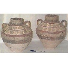 UM PAR DE ÂNFORAS GRANDES (31X95 CM E 33X98 CM) , EM FORMA OVAL, EM TERRACOTA CREME, COM DUAS ALÇAS CADA, NO MEIO SUPERIOR DO CORPO. A PINTURA DECORATIVA CONSISTE EM UM CONJUNTO DE LISTRAS PRETAS GROSSAS E FINAS, E UMA EM TOM AVERMELHADO, COM CÍRCULOS CONCÊNTRICOS ENTRE ELAS; E, É ESPELHADA PARA A PARTE DE BAIXO. FOI FEITA AO LONGO DA CIRCUNFERÊNCIA DOS JARROS. OS DOIS POSSUEM 'PESCOÇO' E UM DELES É MAIS BOJUDO QUE O OUTRO. ACOMPANHA CERTIFICADO DE AUTENTICIDADE, EXPEDIDO POR 'NAJI ASFAR ART ANCIEN', DATADO DE 'BEIRUT, JANUARY 19TH, 2001'. O CERTIFICADO POSSUI FOTOS DOS JARROS E XEROX DE UMA PÁGINA DE UM LIVRO, COMO REFERÊNCIA. ACOMPANHA, TAMBÉM, CARTÃO DO REMETENTE 'RAFIC B. HARIRI PRESIDENT OF THE COUNCIL OF MINISTERS' E NO ENVELOPE: 'H.E. MR. LUIS INÁCIO LULA DA SILVA PRESIDENT OF THE FEDERATIVE REPUBLIC OF BRASIL'.