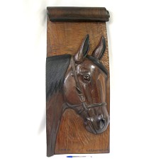 TALHA (87X37,5X7 CM) EM MADEIRA ESCURA, COM A FACE DE UM CAVALO ESCULPIDA NA PARTE FRONTAL. NO CANTO INFERIOR, A INSCRIÇÃO 'IVANILDO / GARANHUNS -PE'. ATRÁS, ORIFÍCIO PARA PENDURÁ-LA.