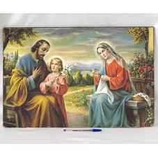 IMAGEM DE PINTURA (39X60 CM) IMPRESSA EM PAPEL, RETRATANDO A SAGRADA FAMÍLIA. COLADA SOBRE BASE DE CORTIÇA. NA PARTE POSTERIOR DA BASE, A INSCRIÇÃO 'ARACY DE COUTO MACHADO / FELIZES OS QUE PROMOVEM A PAZ, ELES SÃO OS FILHOS QUERIDOS DE DEUS / MT. 5, 9'.