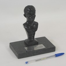 ESCULTURA (14 CM) EM RESINA/GESSO, PINTADA DE PRETO, REPRESENTANDO O BUSTO DE ZUMBI DOS PALMARES. PEÇA FIXADA EM BASE DE GRANITO ESCURO, ONDE HÁ PLACA METÁLICA COM A INSCRIÇÃO 'PATRONO / SENHOR LUIZ INÁCIO LULA DA SILVA / UNIPALMARES - FORMANDOS 2007'.