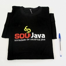 CAMISETA (TAM G) EM MALHA PRETA, DE MANGA CURTA. NA FRENTE, ESTAMPA EM VERMELHO, AMARELO E BRANCO, COM A INSCRIÇÃO 'SOU JAVA / SOCIEDADE DE USUÁRIOS JAVA'.