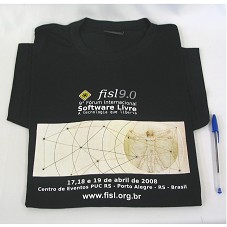DUAS CAMISETAS IGUAIS (TAM G E GG) EM MALHA PRETA, DE MANGA CURTA. NA FRENTE, ESTAMPA EM TONS DE BEGE E MARROM, COM DESENHO DE LEONARDO DA VINCI E A INSCRIÇÃO 'FISL9.0 / 9º FÓRUM INTERNACIONAL DE SOFTWARE LIVRE / A TECNOLOGIA QUE LIBERTA / 17,18 E 19 DE ABRIL DE 2008 / CENTRO DE EVENTOS PUC RS - PORTO ALEGRE - RS - BRASIL / WWW..FISL.ORG.BR'.