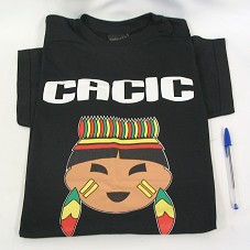 DUAS CAMISETAS IGUAIS (TAM G E GG) EM MALHA PRETA, DE MANGA CURTA. NA FRENTE, ESTAMPA COLORIDA, COM DESENHO ESTILIZADO DE UM ÍNDIO, E A INSCRIÇÃO 'CACIC / SOFWARE PÚBLICO BRASILEIRO'. ATRÁS, 'NOSSA TRIBO É LIVRE'.