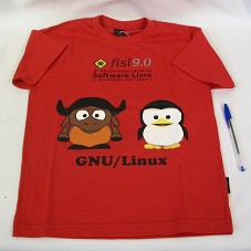 CAMISETA (TAM M) TIPO BABY-LOOK, EM MALHA VERMELHA, DE MANGA CURTA. NA FRENTE, ESTAMPA COLORIDA, COM DESENHO DE UM PINGUIM E UM BÚFALO, E A INSCRIÇÃO 'FISL9.0 / 9º FÓRUM INTERNACIONAL DE SOFTWARE LIVRE / A TECNOLOGIA QUE LIBERTA / GNU/LINUX'.
