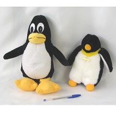 DOIS PÍNGUINS DE PELÚCIA, DE TAMANHOS DIFERENTES. O MAIOR (29 CM) POSSUI OLHOS GRANDES E ARREGALADOS. O MENOR (22,5 CM), COM OLHOS PEQUENOS E ESCUROS, POSSUI NO PEITO UMA PLACA METÁLICA COM A INSCRIÇÃO 'COBRA TECNOLOGIA'.
