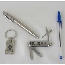 CANETA (13,5 CM) ESFEROGRÁFICA COM CORPO EM METAL ESCOVADO E FUMÊ E DETALHES CROMADOS, POSSUI A GRAVAÇÃO 'FUNDAÇÃO UNIVERSIDADE FEDERAL DO RIO GRANDE' E LOGOMARCA. ACOMPANHA UM CHAVEIRO RETANGULAR (7,5 CM) E UM CANIVETE (5,5 CM) COM FUNÇÕES DE LÂMINA, TESOURA E LIXA, AMBOS COM A LOGOMARCA DA 'FURG'. ACONDICIONADO EM CAIXA DE PAPELÃO PRATEADO, TENDO NA TAMPA A DEDICATÓRIA 'COM TODO O NOSSO CARINHO E AGRADECIMENTO' COM ASSINATURA E CARTÃO DE VISITA DO REMETENTE.