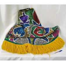 CAPA FOLCLÓRICA, USADA NO MARACATU, COM FRANJAS EM LÃ AMARELA NA BARRA. TODA BORDADA COM LANTEJOULAS E MIÇANGAS COLORIDAS. POSSUI ZÍPER PARA FECHAMENTO.