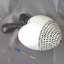 ARTESANATO (45 CM) NO FORMATO DE UM CORAÇÃO, PINTADO DE BRANCO COM DETALHES ESCUROS NA PARTE INFERIOR. POSSUI DOIS CABOS, EM TONS DE MARROM, NA PARTE SUPERIOR. OBJETO LEMBRA FORMATO DE UMA FRUTA. PEÇA FABRICADA POR ARTESÃOS MEXICANOS DE GUADALAJARA JALISCO, SIMBOLIZANDO O AMOR PELO MÉXICO.