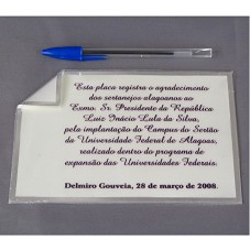 PLACA (12X18 CM) EM METAL PRATEADO, COM FUNDO ESBRANQUIÇADO. POSSUI UMA DAS PONTAS DOBRADAS, E A INSCRIÇÃO 'ESTA PLACA REGISTRA O AGRADECIMENTO DOS SERTANEJOS ALAGOANOS AO EXMO.SR. PRESIDENTE DA REPÚBLICA LUIZ INÁCIO LULA DA SILVA, PELA IMPLANTAÇÃO DO CAMPUS DO SERTÃO DA UNIVERSIDADE FEDERAL DE ALAGOAS, REALIZADO DENTRO DO PROGRAMA DE EXPANSÃO DAS UNIVERSIDADES FEDERAIS. DELMIRO GOUVEIA, 28 DE MARÇO DE 2008.'. ACONDICIONADA EM ESTOJO FORRADO DE LYCRA AZUL MARINHO.