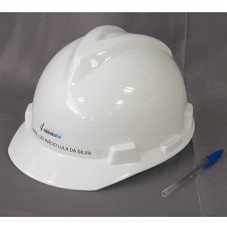 CAPACETE DE PROTEÇÃO COM AJUSTE, UTILIZADO EM CONSTRUÇÃO CIVIL, NA COR BRANCA. NA FRENTE, ADESIVO COM A INSCRIÇÃO 'ESTALEIRO ATLÂNTICO SUL / PRES. LUIZ INÁCIO LULA DA SIVLA', E LOGOMARCA DA INSTITUIÇÃO.