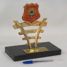 TROFÉU 'DOM PEDRO II'. ESCULTURA (17 CM) EM METAL DOURADO, REPRESENTANDO UM TRILHO FERROVIÁRIO, ONDE HÁ GRAVADO O NOME 'BRASIL', TENDO NA PARTE SUPERIOR O BRASÃO DA 'POLÍCIA FERROVIÁRIA FEDERAL'. FIXADO EM BASE DE GRANITO PRETO, ONDE HÁ PLACA METÁLICA COM A INSCRIÇÃO 'TROFÉU DOM PEDRO II, 155 ANOS A POLÍCIA FERROVIÁRIA FEDERAL RECONHECE E AGRADECE AO EXMO. SR. LUIZ INÁCIO LULA DA SILVA PRESIDENTE DA REPÚBLICA PELO APOIO RECEBIDO.'.