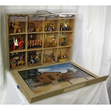 MALA (56X75X8 CM) CONFECCIONADA EM MADEIRA E FORRADA EXTERNAMENTE EM JUTA. CONTÉM DOZE DIVISÓRIAS INTERNAS, FORMANDO UMA VITRINE. AO FUNDO FOTOGRAFIA DA PARTE INTERNA DA 'CASA-MUSEU MESTRE VITALINO'. EM CADA DIVISÓRIA, UM ARTESANATO TÍPICO DA REGIÃO, CONFECCIONADO EM ARGILA POR ARTESÕES REGIONAIS. SOBRE ELES, CAI UMA FOLHA DE ACETATO, COM GRAVAÇÃO EM BRANCO, CONTENDO O TÍTULO E BREVE DESCRIÇÃO DE CADA PEÇA. NA OUTRA FACE DA MALA, FOTOGRAFIA MOSTRANDO ÁREA EXTERNA DA 'CASA-MUSEU'. DO LADO EXTERNO, A INSCRIÇÃO 'O NORDESTE FEITO DE BARRO / PERNAMBUCO - BRASIL / GOVERNO DE PERNAMBUCO'.