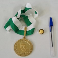 COMENDA PROFESSOR FERNANDO FIGUEIRA COMPOSTA POR: MEDALHA EM METAL DOURADO FIXADA EM FITA NAS CORES BRANCA E VERDE; E BÓTON, EM MESMO MATERIAL, COM EFÍGIE DO PROFESSOR FERNANDO NO ANVERSO, E A INSCRIÇÃO 'COMENDA PROF. FERNANDO FIGUEIRA / IMIP'. NO ANVERSO DA MEDALHA, MESMA EFÍGIE E INSCRIÇÃO; NO REVERSO, LOGOMARCA DO INSTITUTO, LADEADA PELA GRAVAÇÃO 'INSTITUTO MATERNO INFANTIL PROF. FERNANDO FIGUEIRA / IMIP'. EM AMBOS OS LADOS, EM LETRA MENOR, NOME DO ARTISTA 'JOBSON'. ACONDICIONADA EM ESTOJO FORRADO DE NAPA AZUL MARINHO.
