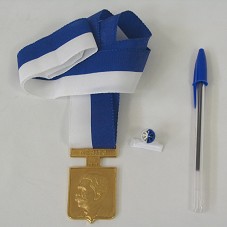 MEDALHA JOAQUIM NABUCO CLASSE OURO COMPOSTA POR: MEDALHA EM METAL DOURADO FIXADA EM FITA NAS CORES BRANCA E AZUL; E BÓTON CIRCULAR COMPOSTO POR FITA NA MESMA COR DA ANTERIOR. NO ANVERSO DA MEDALHA, QUE POSSUI FORMATO DE UM BRASÃO, EFÍGIE DE JOAQUIM NABUCO E INSCRIÇÃO 'MÉRITO'; NO REVERSO, COROA DE RAMOS CIRCUNDANDO A GRAVAÇÃO 'RECONHECIMENTO DO LEGISLATIVO PERNAMBUCANO'. ACONDICIONADA EM ESTOJO FORRADO DE NAPA AZUL MARINHO.