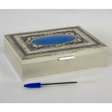 PORTA JÓIAS (5,5X20,5X15,5 CM) CONFECCIONADO EM PRATA 925. POSSUI TAMPA TRABALHADA COM MOSAICO DE MADREPÉROLA E PINTURA EM ESMALTE-CLOISONNÉ, ALÉM DA PRATA, FORMANDO DESENHO DE FLORES. NA LATERAL FRONTAL, O BRASÃO DA REPÚBLICA INDIANA GRAVADO. NA PARTE INTERNA, SOLTO DA PEÇA, DIVISÓRIA EM ACRÍLICO TRANSPARENTE. ACOMPANHA CARTÃO DO AGENTE. ACONDICIONADO EM CAIXA FORRADA DE VELUDO AZUL MARINHO.