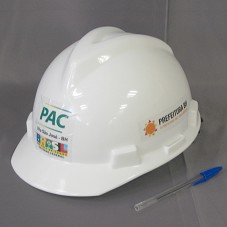CAPACETE DE PROTEÇÃO, UTILIZADO EM OBRA E CONSTRUÇÃO CIVIL, NA COR BRANCA. NA FRENTE, ADESIVO COM A INSCRIÇÃO 'PAC / VILA SÃO JOSÉ - BH' E LOGOMARCA DO GOVERNO FEDERAL. NAS LATERAIS, 'PREFEITURA BH / A PREFEITURA FAZ. BH ACONTECE.' E LOGOMARCA.