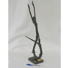 ESCULTURA (50 CM) CONFECCIONADA EM GALHOS DE MADEIRA CURVADOS, REPRESENTANDO DUAS MULHERES EM MOVIMENTO DE EQUILÍBRIO E DANÇA. FIXADA EM BASE DE MÁRMORE ESCURO ESVERDEADO, ONDE HÁ PLACA METÁLICA COM A INSCRIÇÃO 'EMÍDIO DE SOUZA / ESCULTOR / RIBEIRÃO DAS NEVES-MG / 17 DE ABRIL 2008'.