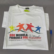CAMISETA (TAM XXG) EM MALHA BRANCA, DE MANGA CURTA. NA FRENTE, ESTAMPA COLORIDA, CONTENDO A INSCRIÇÃO 'DOE MEDULA / PROMOVA A VIDA / CAMPANHA DE DOAÇÃO DE ÓRGÃOS, MEDULA, TECIDOS E SANGUE / PSIND MG - SINDICATO DOS PSICÓLOGOS DE MINAS GERAIS'.