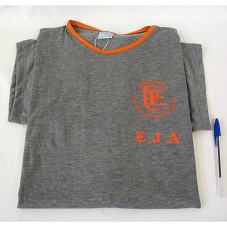 CAMISETA (TAM GG) EM MALHA CINZA, DE MANGA CURTA, COM DETALHES EM LARANJA. NA FRENTE, A INSCRIÇÃO 'SAÚDE E PAZ / CPE / COLÉGIO PADRE EUSTÁQUIO / EJA'.