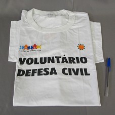 CAMISETA (TAM G) EM MALHA BRANCA, DE MANGA CURTA. NA FRENTE, ESTAMPA CONTENDO A INSCRIÇÃO 'NUDEC / NÚCLEO DE DEFESA CIVIL / VOLUNTÁRIO DEFESA CIVIL'. ATRÁS, 'PREFEITURA BH / TRABALHO PELA VIDA'.