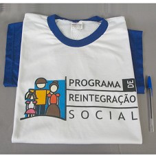 CAMISETA (TAM G) EM MALHA BRANCA, DE MANGAS CURTAS E AZUIS. NA FRENTE, ESTAMPA CONTENDO A INSCRIÇÃO 'PROGRAMA DE REINTEGRAÇÃO SOCIAL' E DESENHO DE UMA FAMÍLIA. ATRÁS, 'GOVERNO DE MINAS' E LOGOMARCA.
