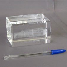 ESCULTURA (6,5X10X7 CM) EM CRISTAL, NO FORMATO DE UM PARALELEPÍPEDO. POSSUI IMAGEM TRIDIMENSIONAL GRAVADA A LASER EM SEU INTERIOR, REPRESENTANDO A ARQUITETURA DE UM PRÉDIO ANTIGO. NA FRENTE, A INSCRIÇÃO 'EERSTE KAMER DER STATEN-GENERAL'. ACOMPANHA DOIS CARTÕES DE VISITA E UM DO FABRICANTE.