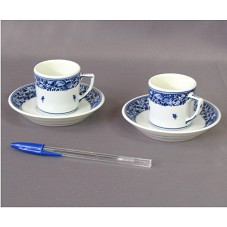 PAR DE XÍCARAS ACOMPANHADAS DE PIRES, UTILIZADAS PARA CAFÉ, EM PORCELANA BRANCA, COM PINTURA EM TONS DE AZUL, DE MOTIVO FLORAIS. NO FUNDO DE CADA PEÇA ETIQUETA DO FABRICANTE E GRAVAÇÃO COM CARIMBO E INSCRIÇÃO 'DELFT' E O NÚMERO '1186'. ACOMPANHA DOIS CERTIFICADOS DE GARANTIA E UM CARTÃO EM NOME DO AGENTE. ACONDICIONADAS EM CAIXA DE PAPELÃO BRANCO, COM NOME DO FABRICANTE.