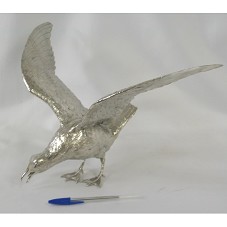ESCULTURA (22X37X24 CM) CONFECCIONADA EM PRATA 925. REPRESENTA UMA POMBA, COM AS ASAS ABERTAS, PESCOÇO INCLINADO PARA BAIXO, E O BICO ABERTO. ACONDICIONADA EM CAIXA FORRADA DE AZUL MARINHO, COM SÍMBOLO DE UMA COROA NA TAMPA.