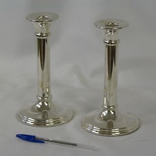 PAR DE CASTIÇAIS (19 CM CADA) CONFECCIONADOS EM PRATA 925. POSSUEM O SÍMBOLO DA COROA REAL GRAVADO NO CORPO DO CASTIÇAL. ACONDICIONADOS EM CAIXA FORRADA DE AZUL MARINHO, COM SÍMBOLO DE UMA COROA NA TAMPA.