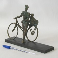 ESCULTURA (14 CM) CONFECCIONADA EM BRONZE, FIXADA EM BASE RETANGULAR DE METAL. REPRESENTA UMA MULHER SEGURANDO UM BUQUÊ DE FLORES E UMA BICICLETA. NA GARUPA DA BICICLETA, UMA CESTA COM UM CÃO.